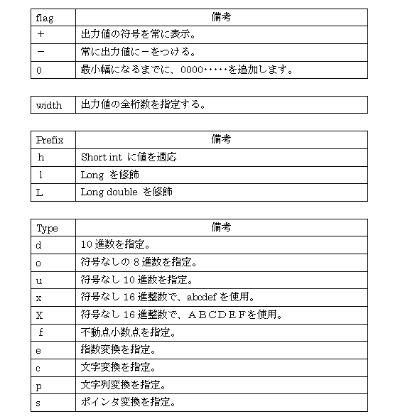 そしてその下の、Widthが値の幅になり、Precisionが値の精度の指定にあたり、TypePrefixが変数型への対応の指定、typeが変数方の指定に当たります。それぞれの記述の方法は、以下のようになります。