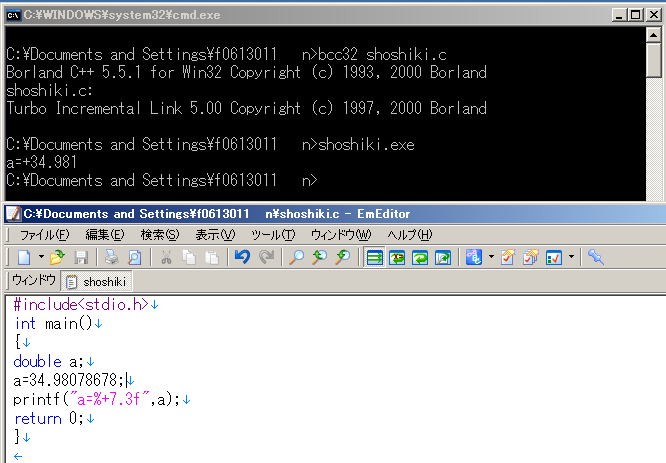 今までは、a,bの関係をほかの変数として指定(c=a/b;)していましたが、それをしなくても、式として評価され値を持つ性質を使い、Printfの関数の中に関係式を書くことで同じ結果が得られます。